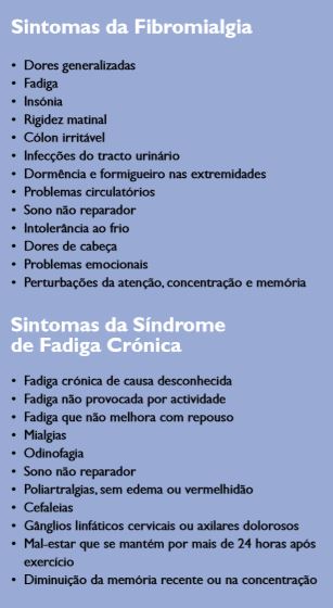 Os sintomas da fibromialgia e da síndrome de fadiga crónica variam consoante a pessoa e ao longo do tempo, dificultando o tratamento destas patologias e a adaptação dos doentes a um estilo de vida que lhes permita lidar com as doenças. Fadiga, dores musculares e articulares, alterações de sono e sono não reparador, alterações psicológicas, depressão, ansiedade, alergias a vários níveis, cefaleias, inflamações na garganta, perturbações gastrointestinais, tonturas, formigueiro nas mãos e perturbações cognitivas, como perdas temporárias de memória, são exemplos elucidativos das consequências destas duas patologias. Diagnosticar a doença não é simples, até porque não existem análises ou testes, até à data, que permitam aferir se um individuo tem ou não alguma destas doenças. Os critérios para definir a doença são básicos: a conjugação de sintomas durante um período de tempo prolongado numa pessoa que não padecia deles permite fazer um diagnóstico por exclusão. No caso da fibromialgia, ter há mais de três meses dor musculo-esquelética difusa e ter pelo menos 11 pontos dolorosos em 18 localizações pré-estabelecidas são os critérios suficientes para definir a doença. Mas, para além destes dois critérios, é necessário que o doente apresente mais dois destes quatro sintomas: fadiga, alterações do sono, perturbações emocionais e dores de cabeça. Os exames auxiliares de diagnóstico servem para afastar outras doenças que podem ter semelhanças com estas. No caso da síndrome de fadiga crónica, o início dos sintomas pode começar, muitas vezes, por um simples mal-estar semelhante ao da gripe.
